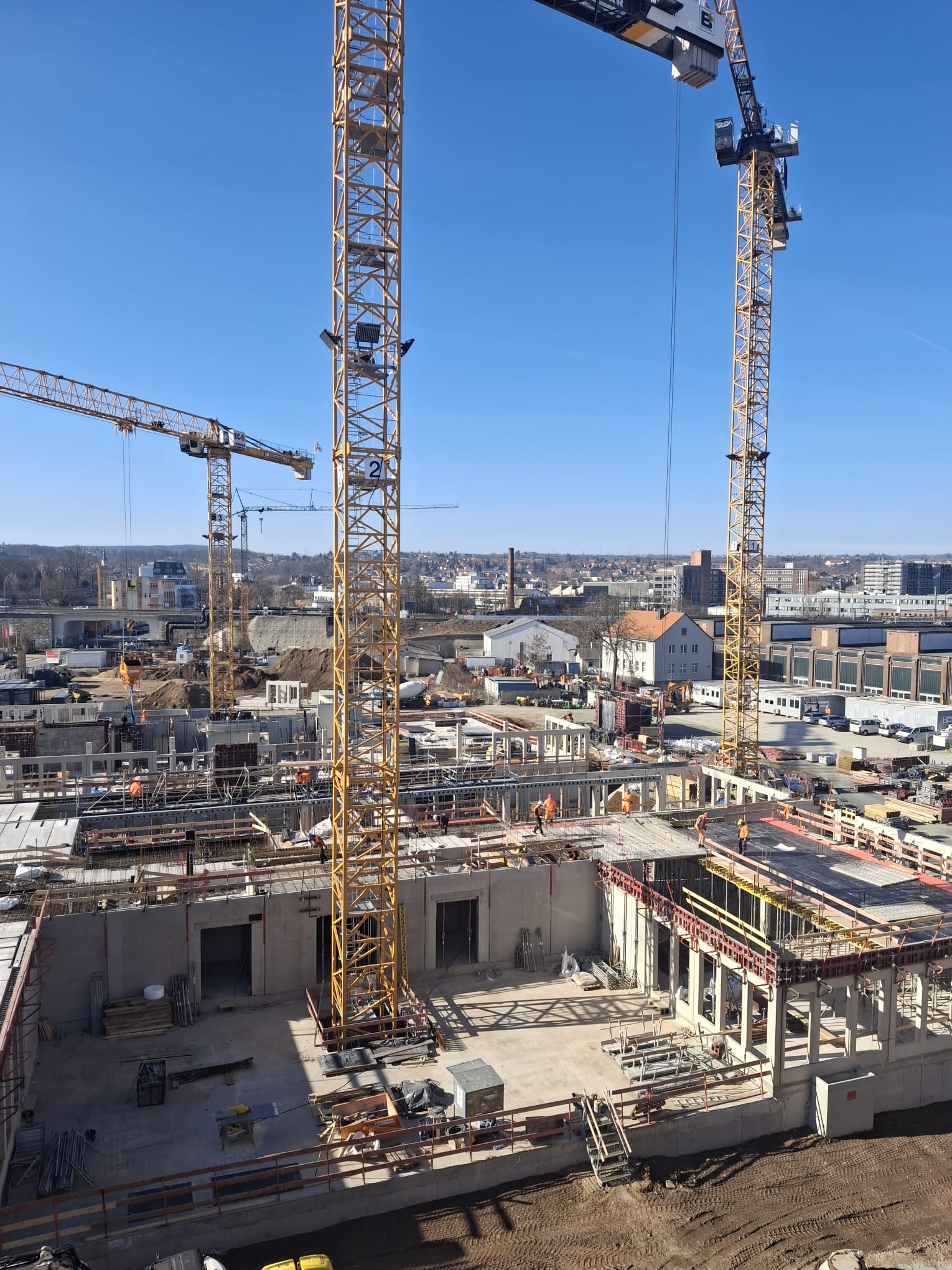 Auf der Baustelle der UNIVERSELLEN WERKE Dresden erreicht Haus C den nächsten Schritt im Rohbau: Die Deckenelemente über dem Erdgeschoss sind eingebaut. Damit ist die Tragstruktur auf Erdgeschossebene geschlossen. Der Baufortschritt wird deutlich sichtbar, die nächsten Arbeiten im aufgehenden Rohbau schließen unmittelbar an.