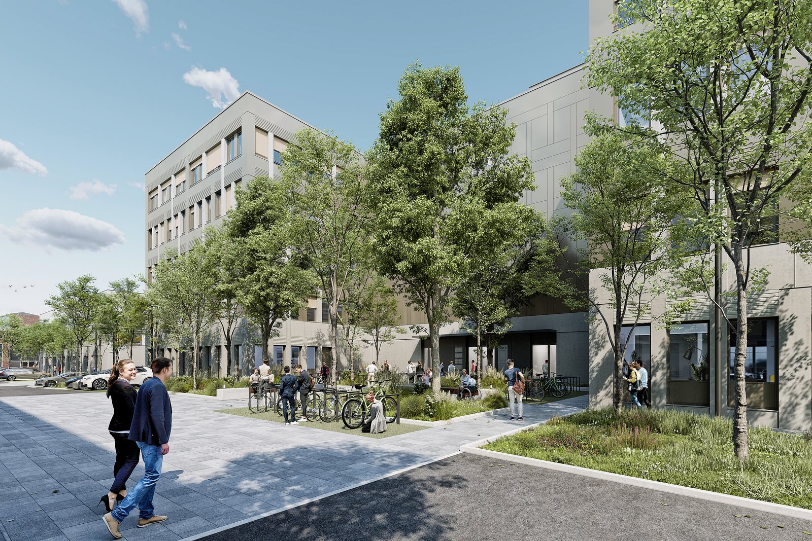 - Hohe Aufenthaltsqualität durch großzügige Quartiersflächen und biodiverse Bepflanzung