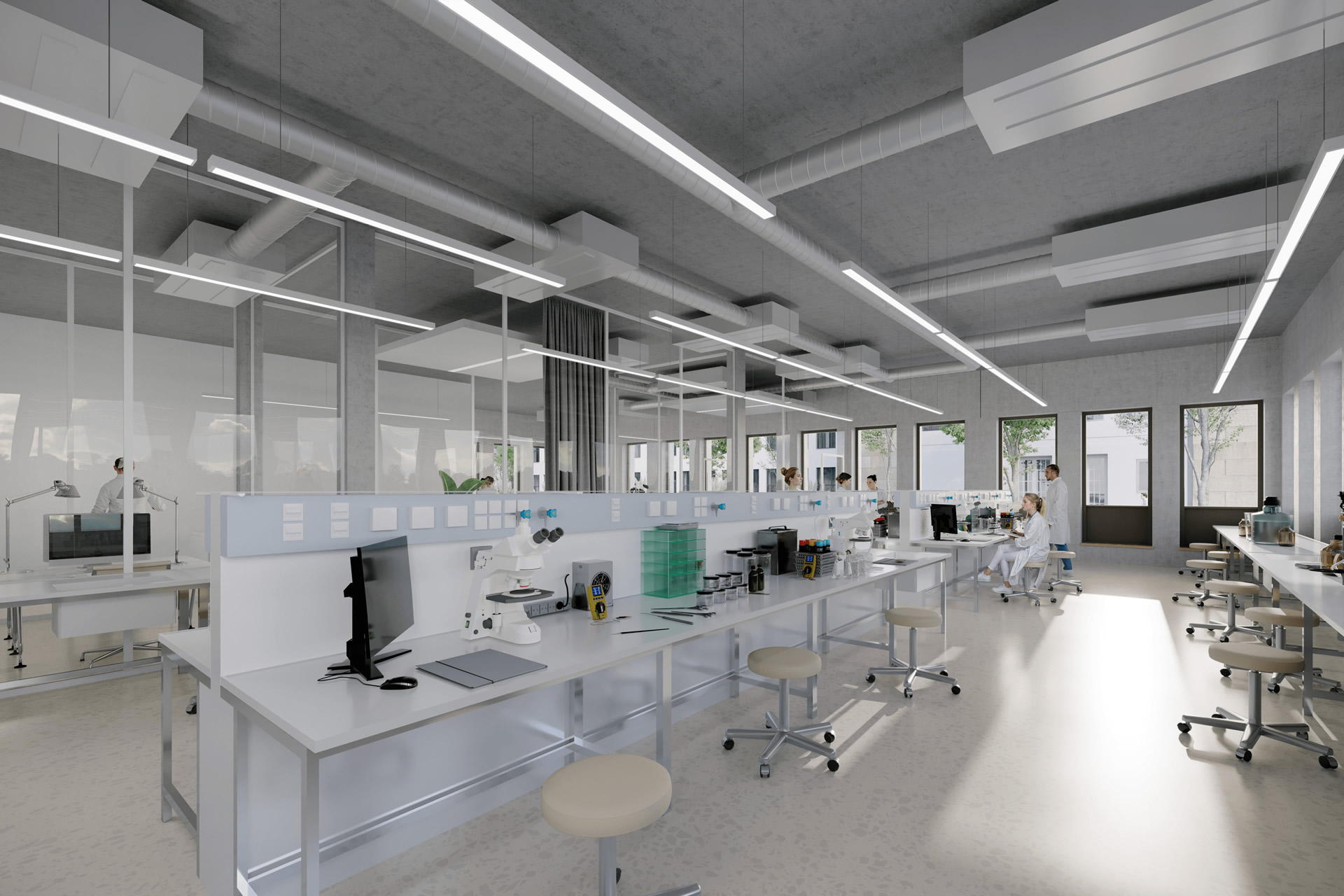 Einheiten ab 350 Quadratmetern bieten Spielraum für unterschiedliche Nutzungskonzepte. Im Erdgeschoss und im ersten Obergeschoss sind sowohl Laborbereiche als auch Büroflächen vorgesehen. Beide Nutzungsarten können kombiniert oder getrennt organisiert werden.